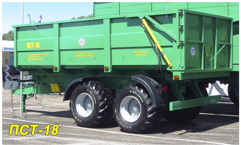 Полуприцеп тракторный ПСТ-18 - это унифицированный полуприцеп повышенной грузоподъемности на широкопрофильных шинах к тракторам тяговых классов 2-5. Основной цельнометаллический кузов с открывающимся при помощи гидроцилиндров бортом имеет вместимость рассчитанную на транспортировку различных материалов средней плотности (земля, мусор, навоз, силос готовый, удобрения минеральные) . По заказу, для перевозки семян различных культур, корнеплодов, комбикорма прицепы комплектуются низкими надставными бортами, а для легковесных грузов - высокими надставными бортами.
